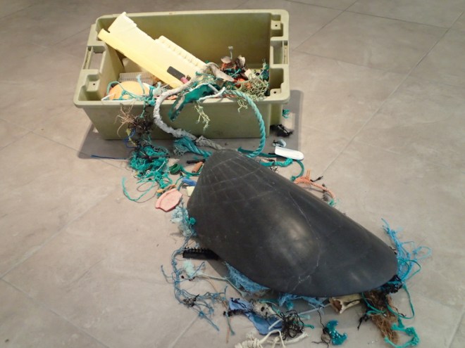 I was asked by Maggie Magee to exhibit at Dublin biennial 2014. The exhibition was in June at the CHQ in the Dublin Docklands (See Dublin Biennial Post). There was an environmental theme to the exhibition. I presented the mussel shell spilling out of a fish crate along with plastic debris collected from a beach by Annagh Head, near Bellmullet, Co. Mayo. I wanted to highlight the plastic pollution in the oceans and how it is contaminating the flora and fauna of the sea and the food we eat! I also exhibited my “Pelvis” piece I made in 2012.