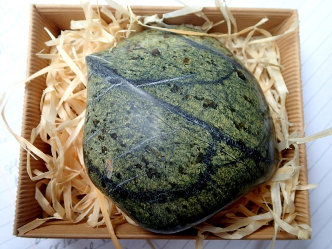 This was a small stone I found on a beach in Mayo last year. I decided to give it a polish and it polished up beautifully! Not sure what it is but possibly a piece of Connemara Marble/serpentine?? The red crystals/inclusions are possibly garnet? It has gone, as another birthday present!!