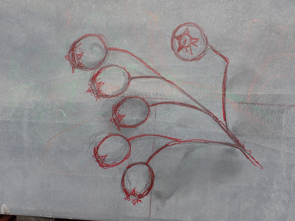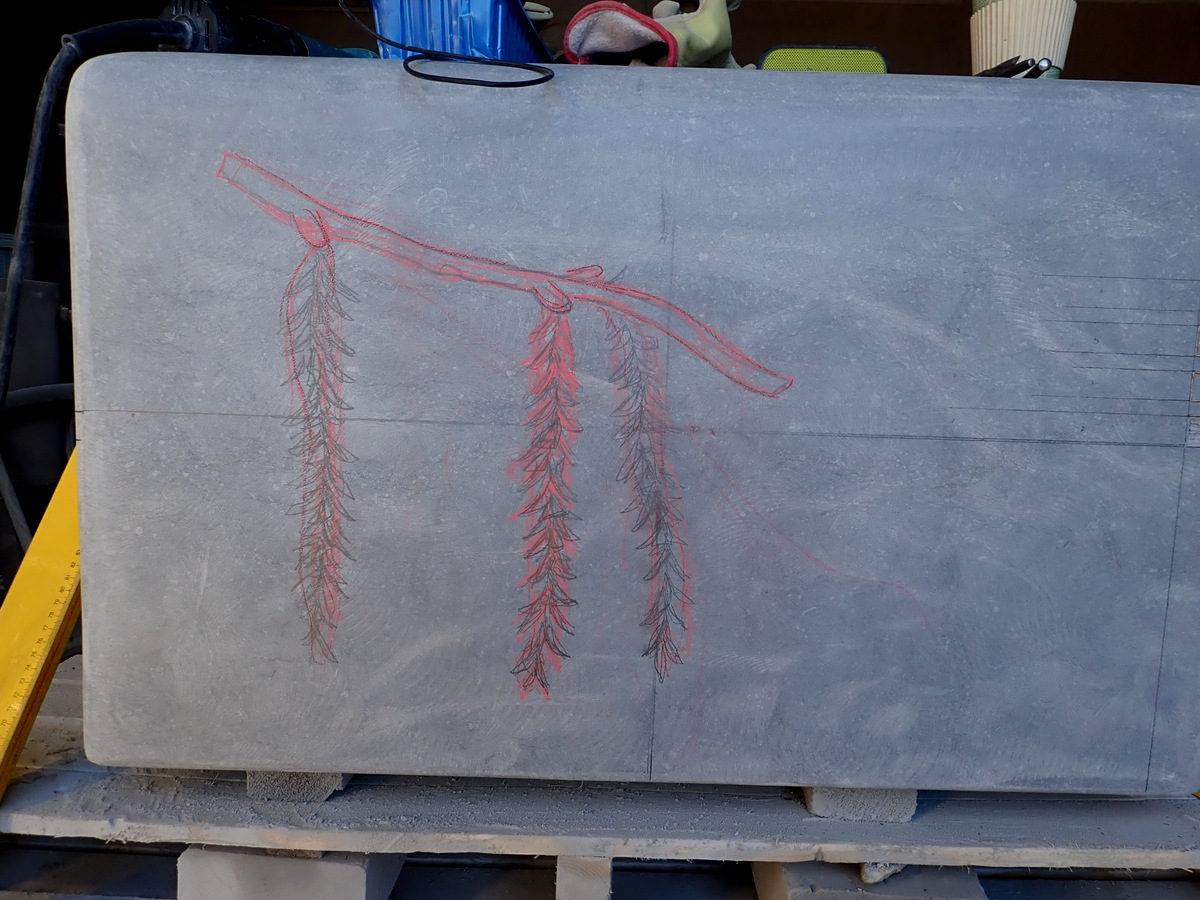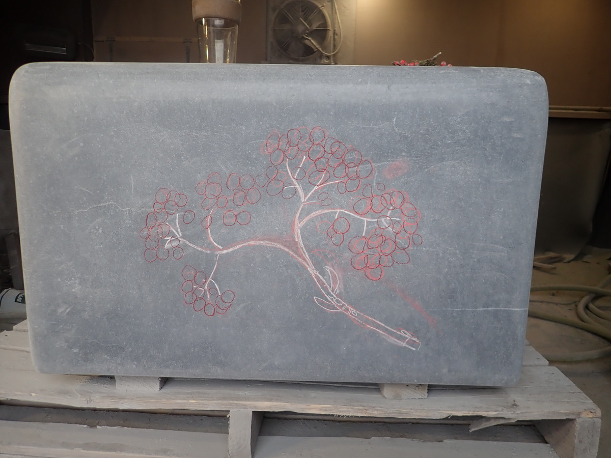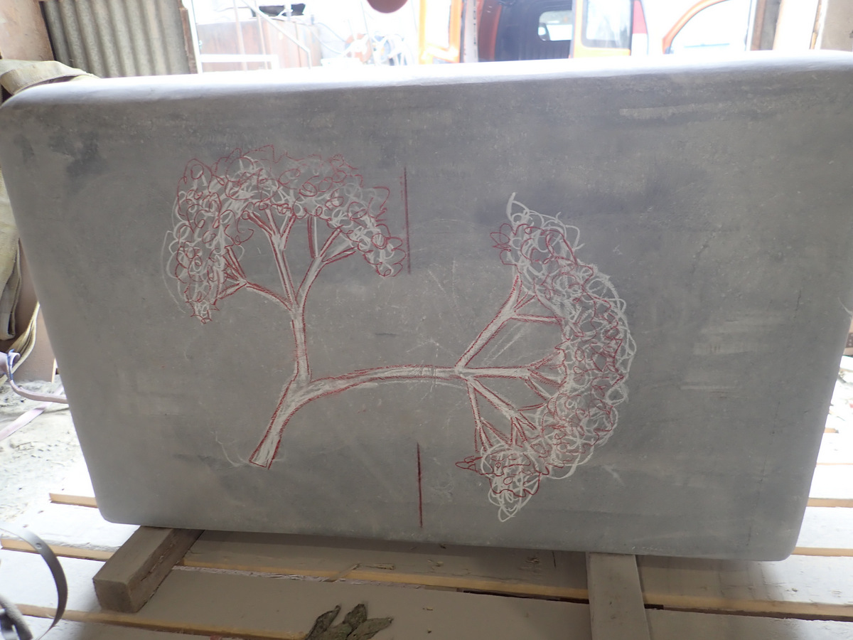 The next step in the process was to draw the images onto the stone before I started carving. The following are photos of work in progress of some of the seats.