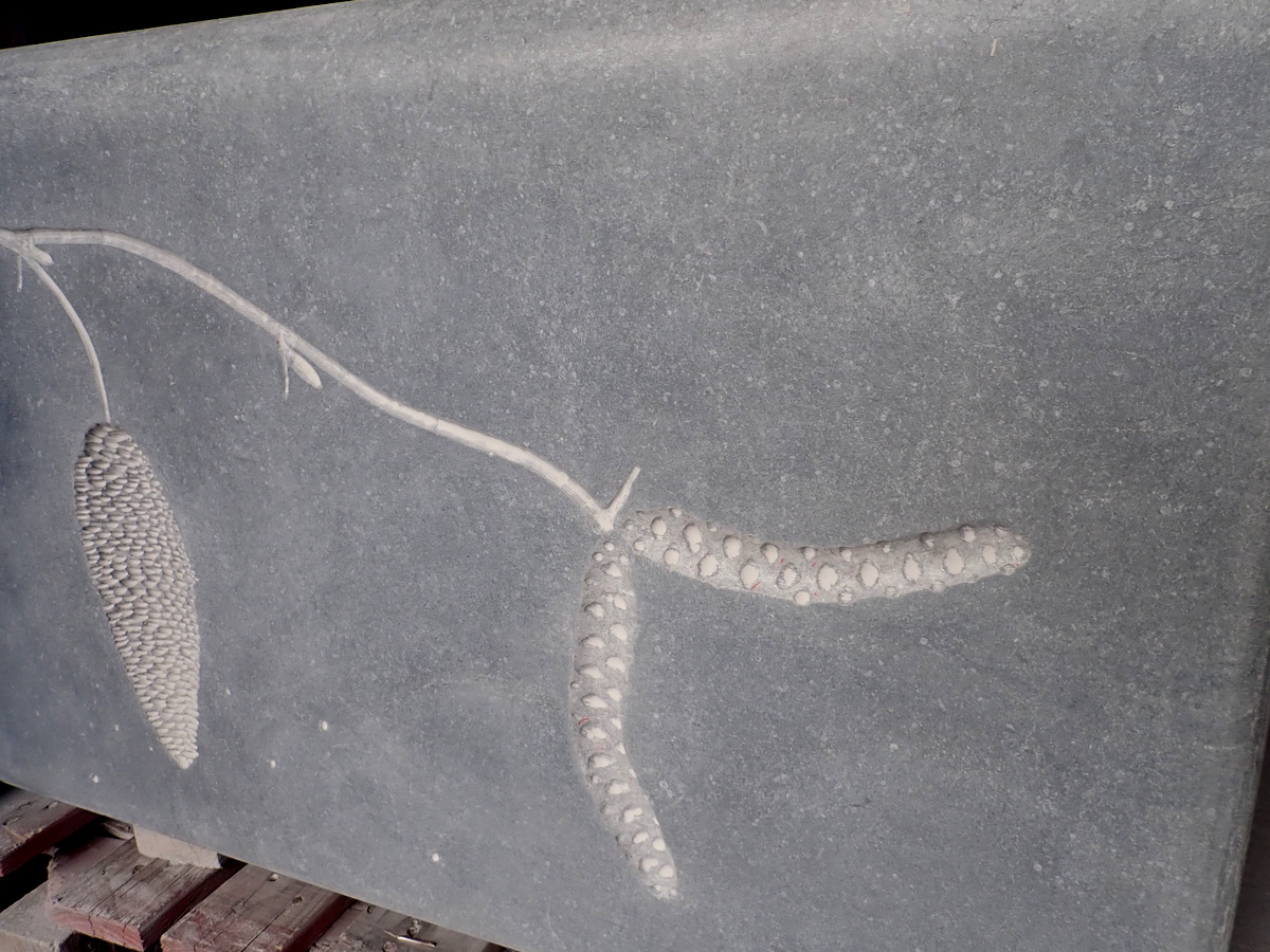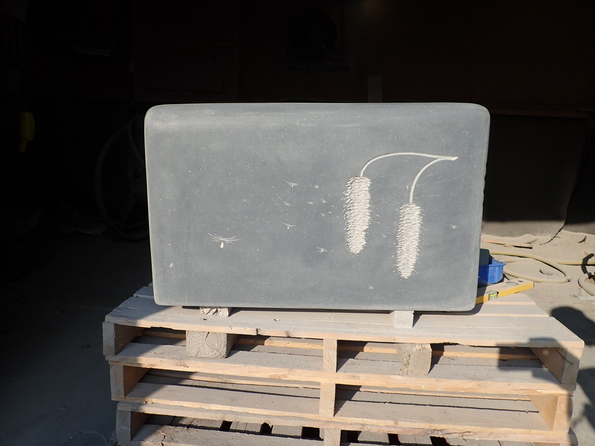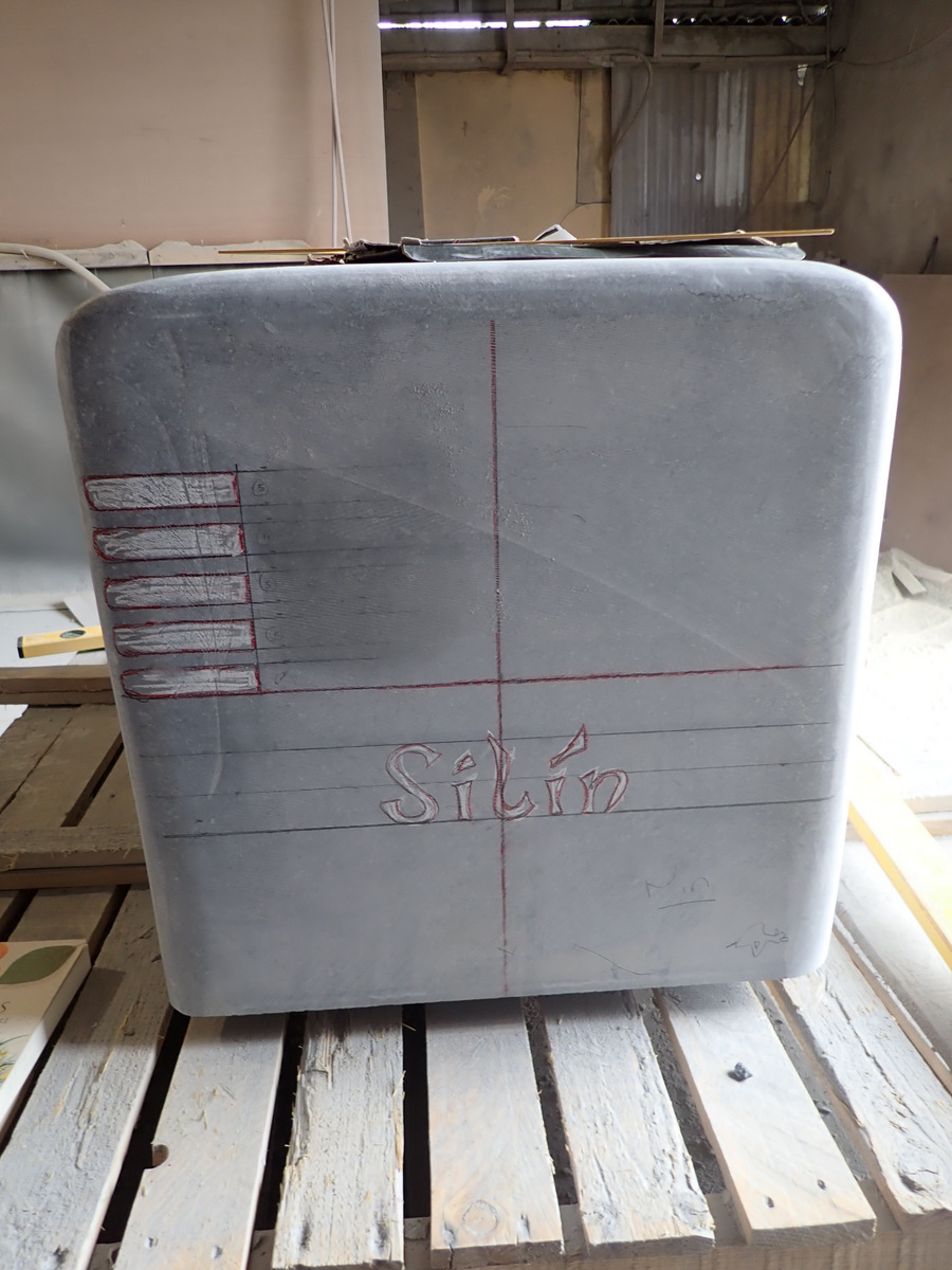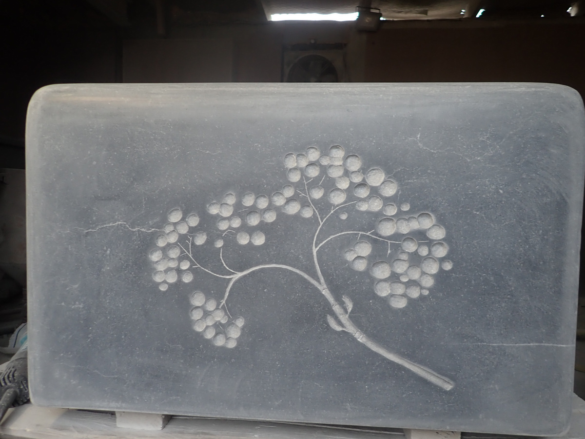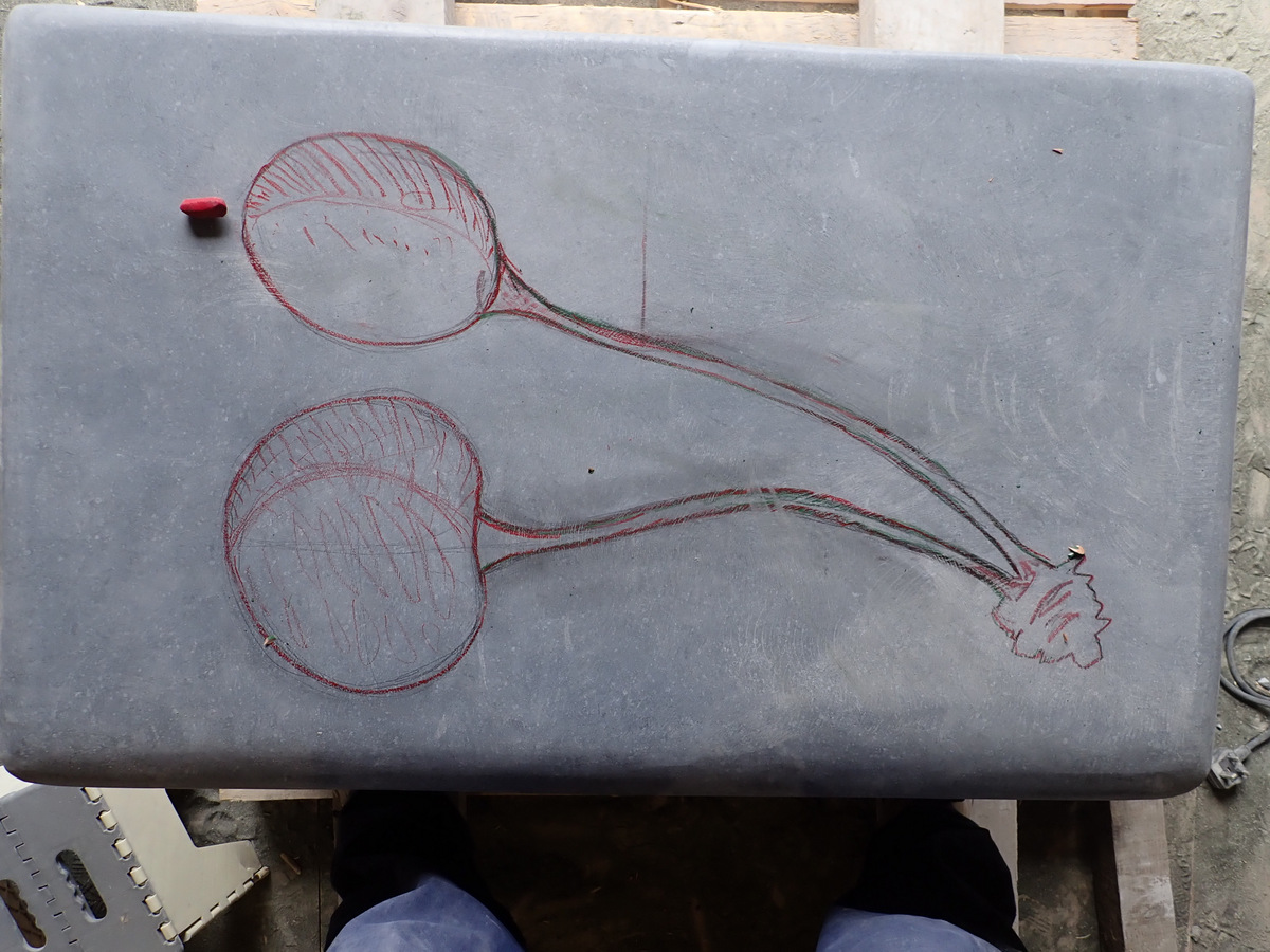 The next step in the process was to draw the images onto the stone before I started carving. The following are photos of work in progress of some of the seats.
