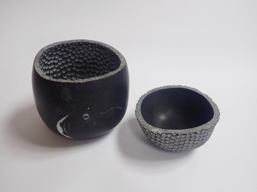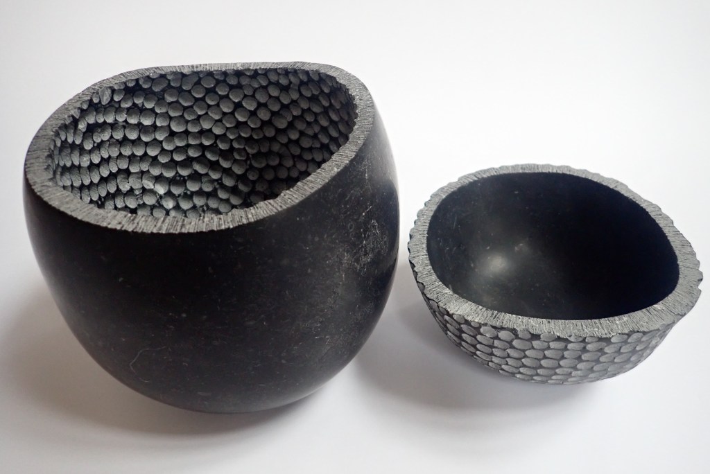 HIVE: A vessel, a pod, a haven for insects! The pattern is individual cells, a latticework for individual organisms, colonial, like the corals fossilised in the carboniferous limestone of which the vessel is formed . A framework for life to extend their honeycombs, to grow their larvae. Wasps nests and bee hives were the inspiration. The idea of inside-out and outside-in is explored. The top of the pod has been inverted or flipped inside out to expose the internal pattern.